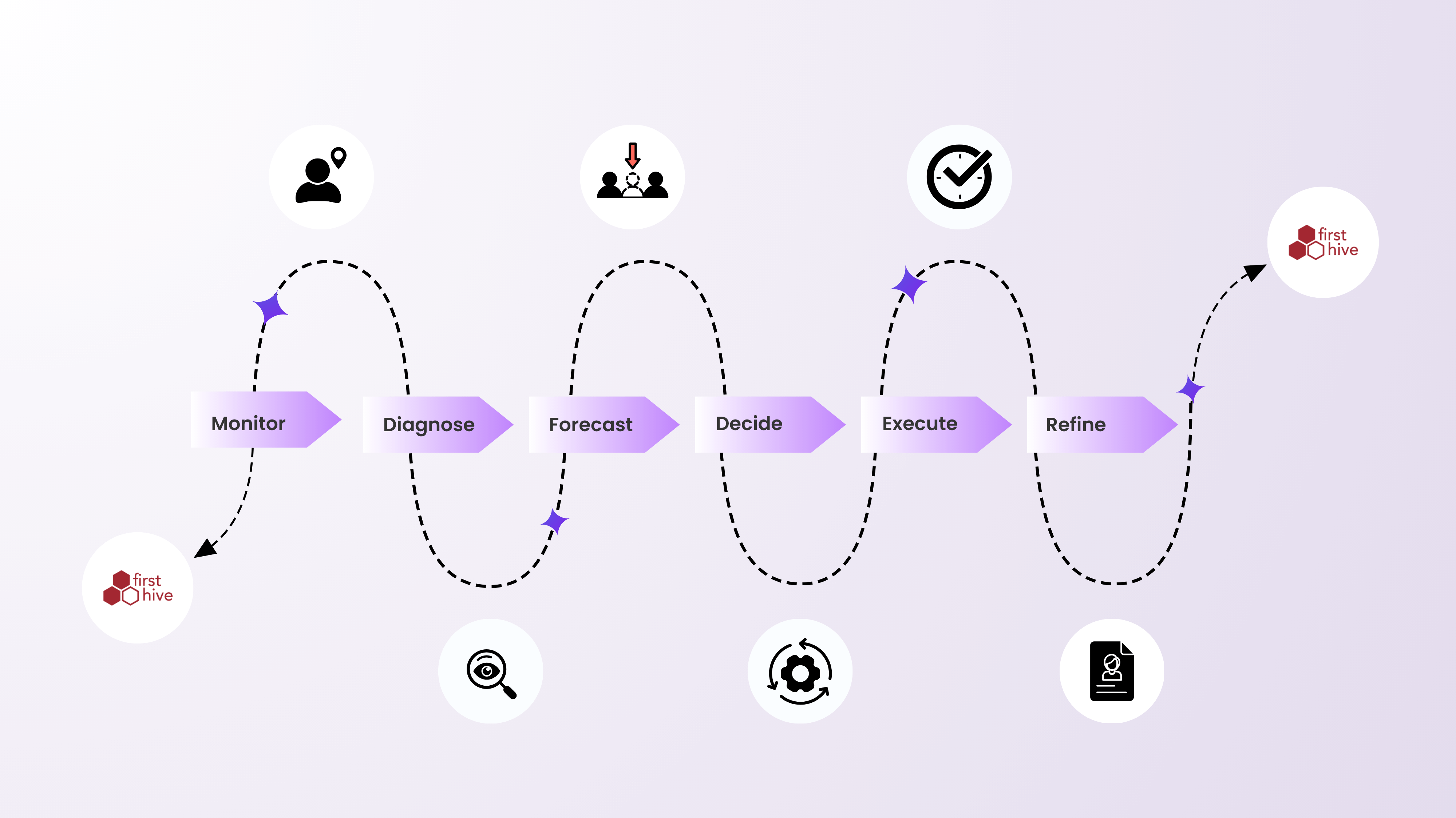 The journey from customer signal to strategic action happens in six continuous stages within FirstHive's Marketing Control Tower—this coordinated workflow is what makes it a true CDP evolution: